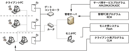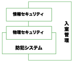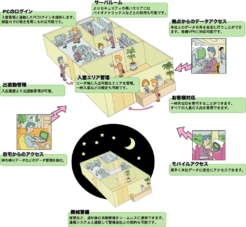 今までの防犯システムと情報セキュリティ、および入室管理システムを統合して管理運用できるシステムです。個別のユーザと個別のゲートの管理、および入出履歴や出退勤管理との連動も可能になります。